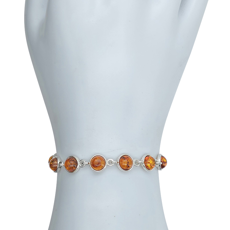 Cognac Amber Sterling Silver Link Bracelet. Round shaped amber stones set in .925 sterling silver. The bracelet has an extension chain.