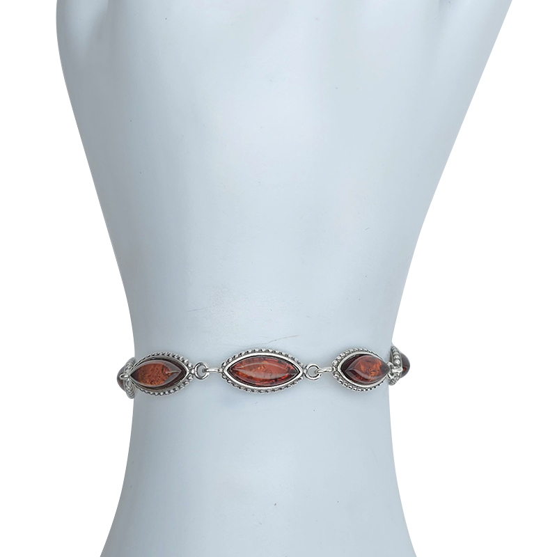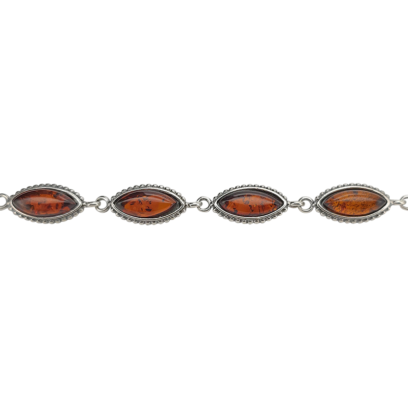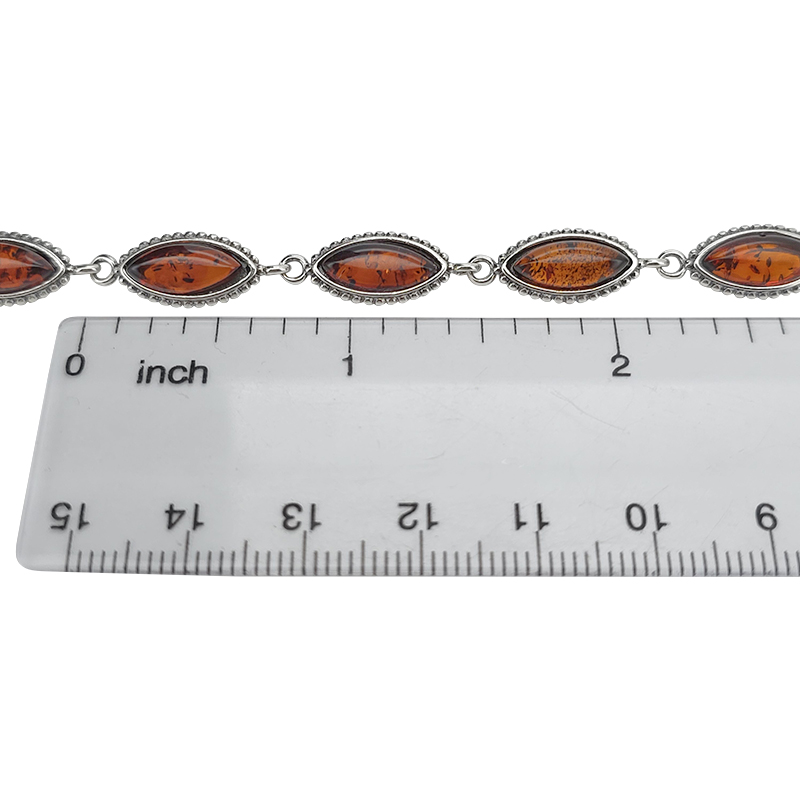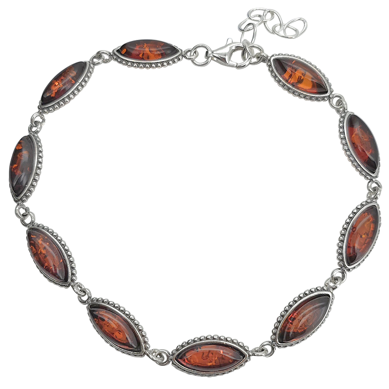 Cognac Amber Sterling Silver Link Bracelet. Marquise-shaped amber stones set in .925 sterling silver. 7″ long with 1″ extension. Genuine Baltic amber.