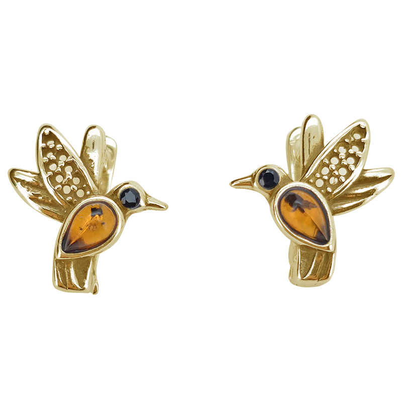 Amber Gold Plated Silver Hummingbird Earrings. Teardrop-shaped amber stones are set in .925 sterling silver. 14K Gold Plated. Genuine Baltic amber.