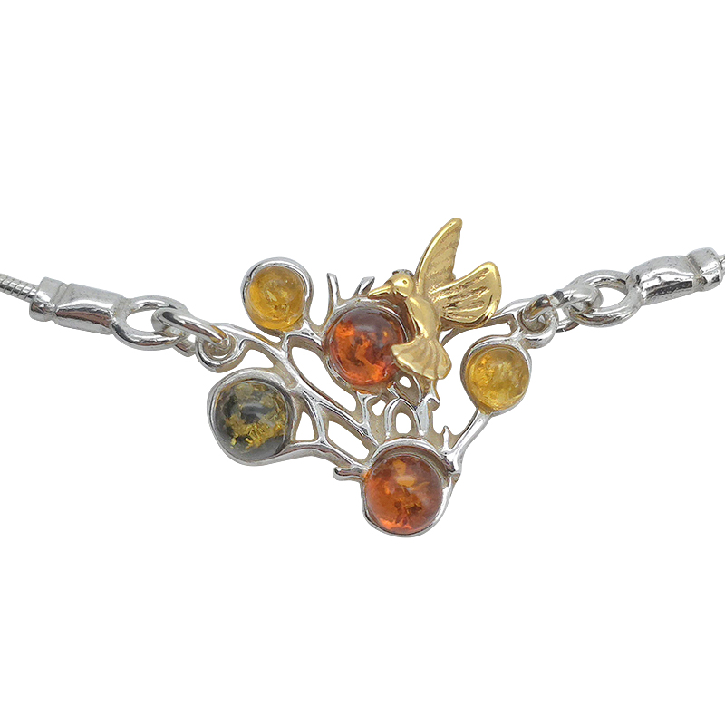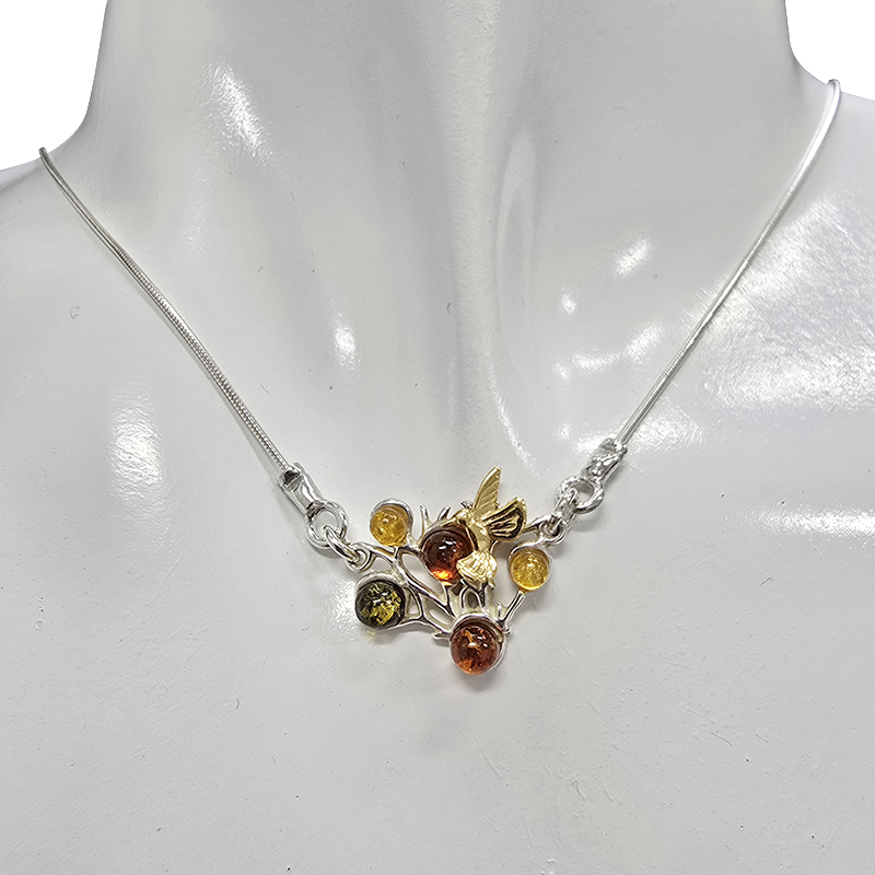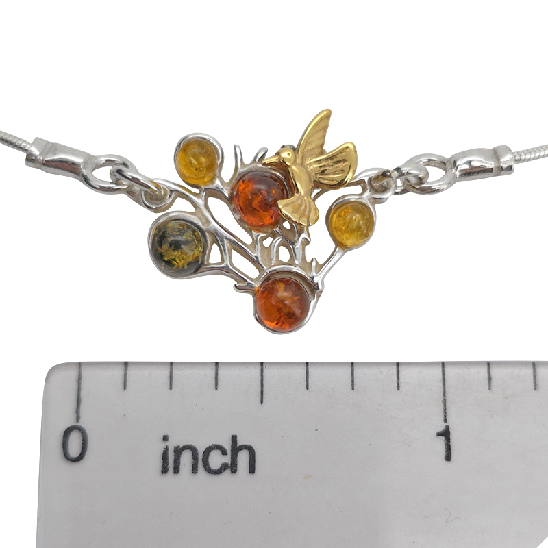 Amber Sterling Silver Hummingbird in Branches Necklace. Round, multi-colored amber stones set in 925 sterling silver. 14K Gold Plated. 17″ long with 2″ extension. Genuine Baltic amber.