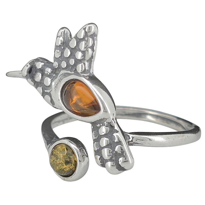 Multi-Color Amber Sterling Silver Hummingbird Adjustable Ring. Cognac, and green-color amber stones set in .925 sterling silver. Genuine Baltic amber.