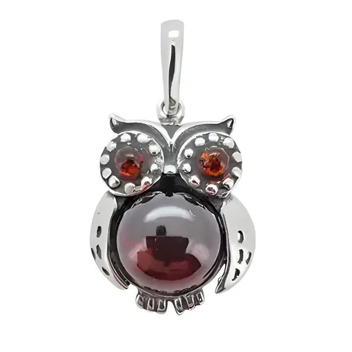 Owl cherry amber silver pendant. Cherry amber stones are set in .925 sterling silver. Genuine Baltic amber.