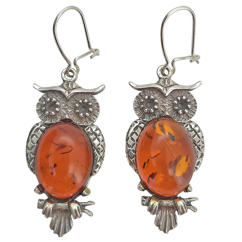 Owl Cognac Amber Sterling Silver Earrings On Hooks