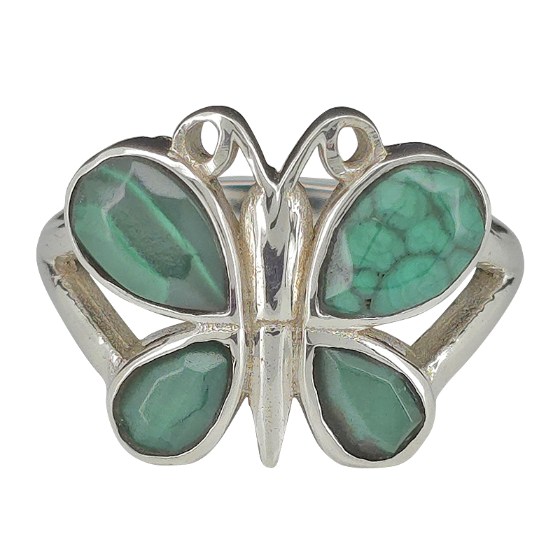 Faceted Malachite Sterling Silver Butterfly Ring. Teardrop-shaped gemstones set in .925 sterling silver. Gemstone ring.