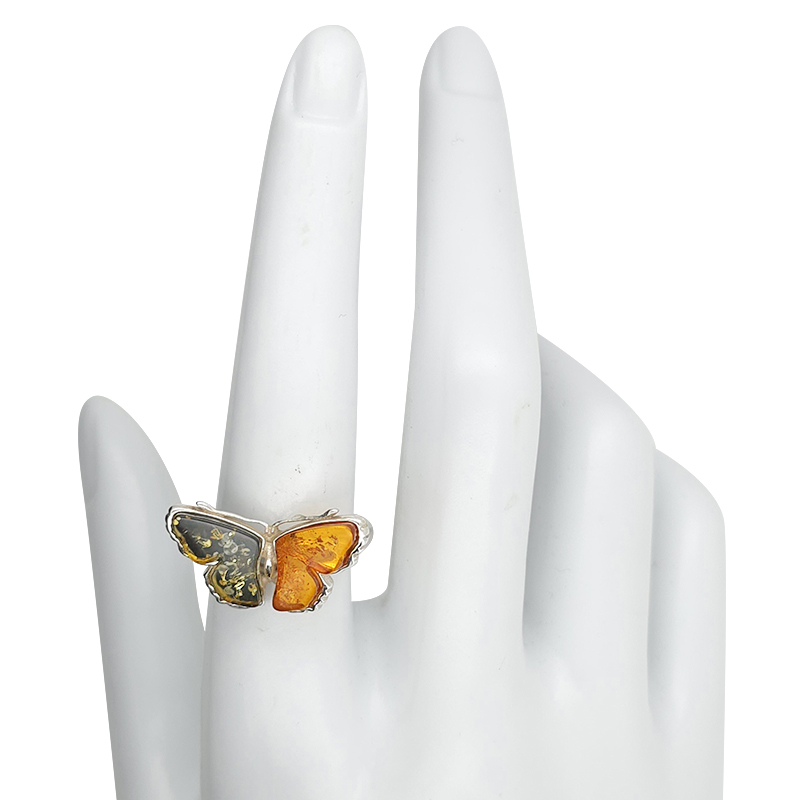 Multi-Color Amber Sterling Silver Butterfly Adjustable Ring. Green and cognac color amber stones set in .925 sterling silver. Genuine Baltic amber.