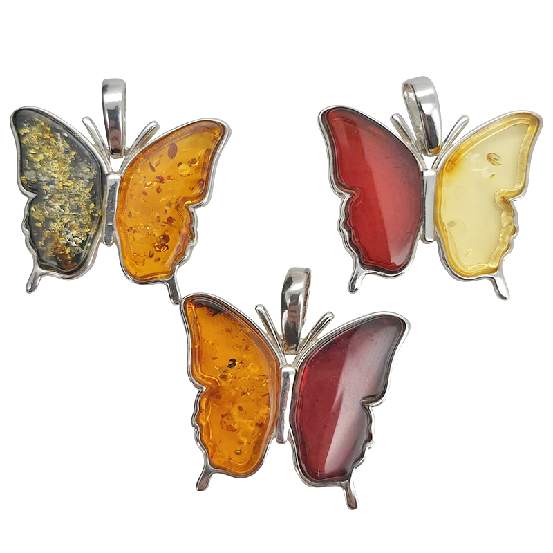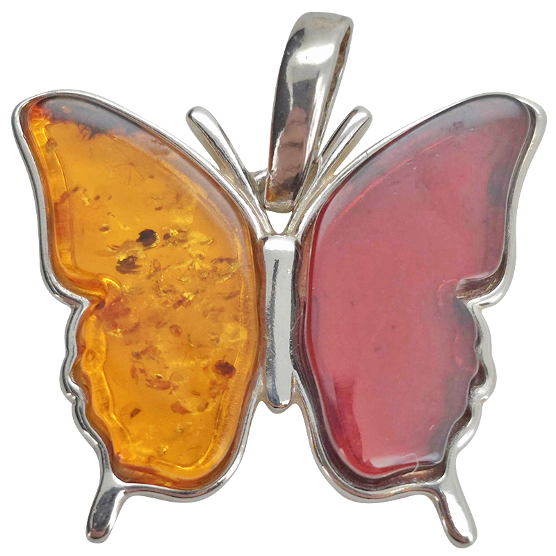 Multi Color Amber Sterling Silver Butterfly Pendant