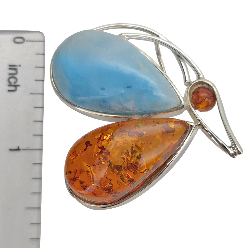Natural Amber/Larimar Sterling Silver Butterfly Handmade Pendant. Teardrop-shaped Lorimar and amber stones set in .925 sterling silver. Genuine Baltic amber.