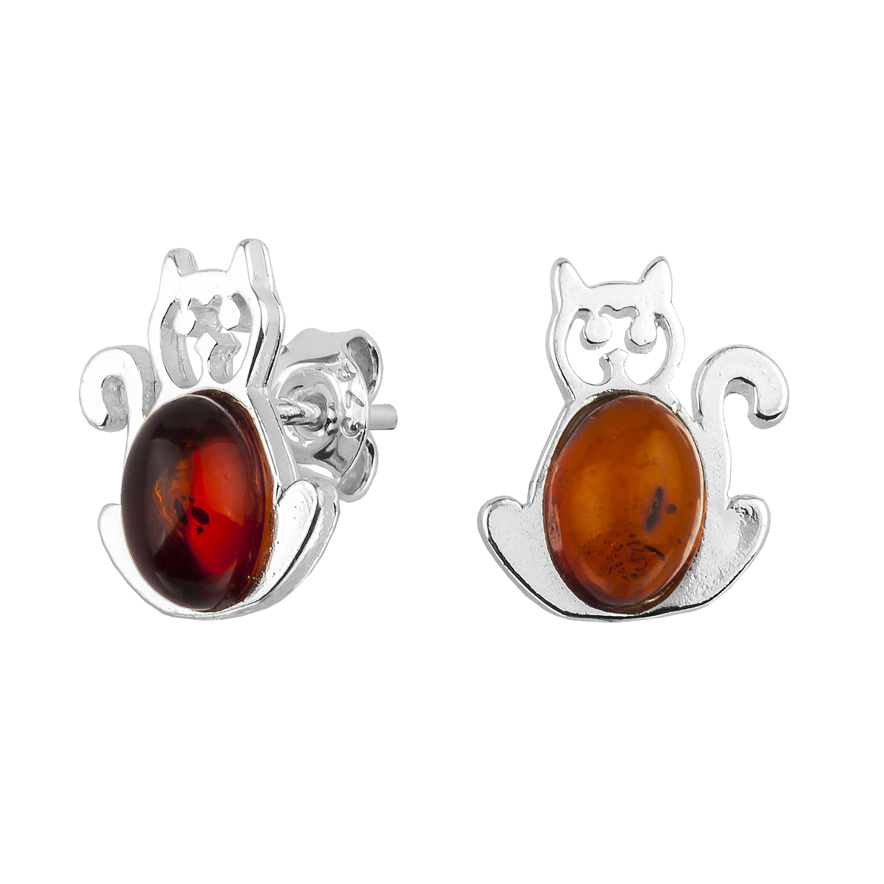 Baltic Amber Sterling Silver Cats Earrings. Cognac Cats Amber Stud Earrings. Cognac amber stones set in .925 sterling silver. Genuine Baltic Amber jewelry