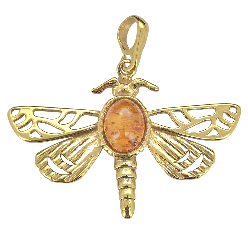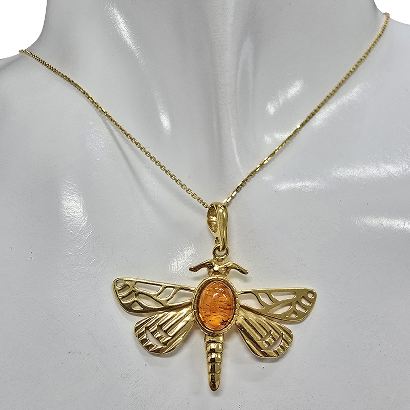 Dragonfly cognac amber gold plated silver pendant. Cognac color oval-shaped amber stone is set in .925 sterling gold plated silver. Genuine Baltic amber.