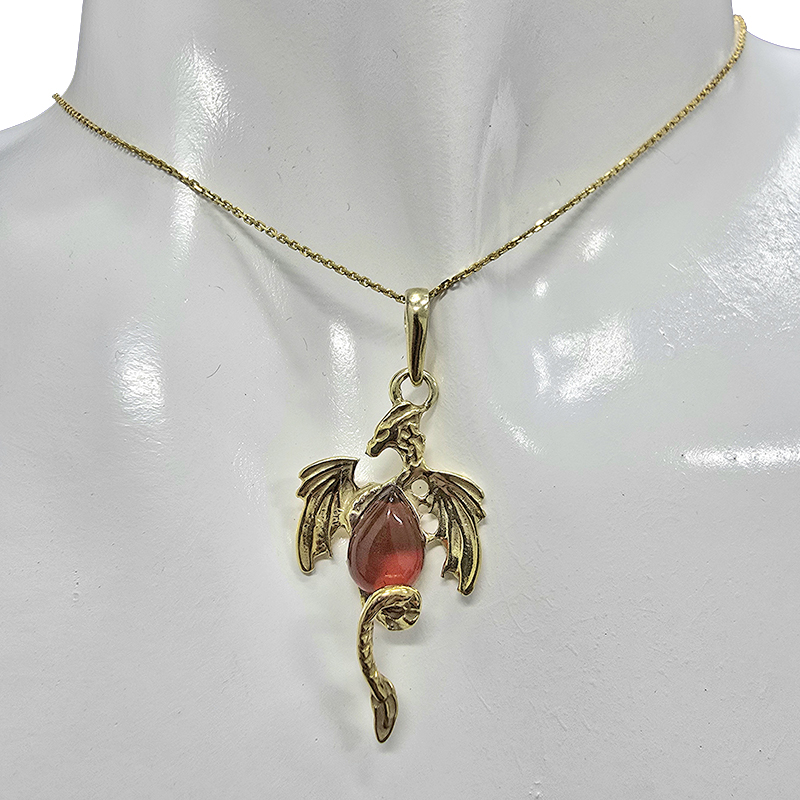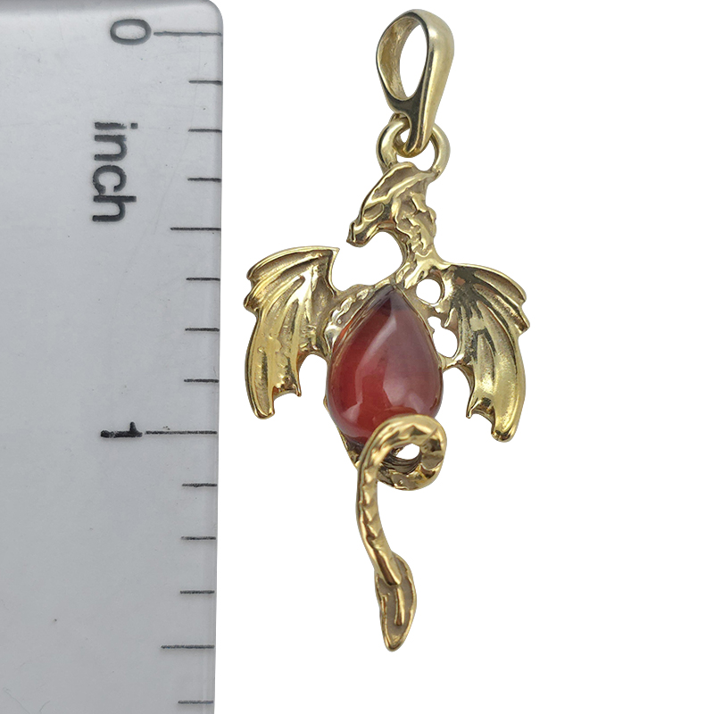 Amber Gold Plated Silver Dragon Pendant. Oval-shaped cherry color amber stone set in .925 sterling silver. 14K Gold Plated.