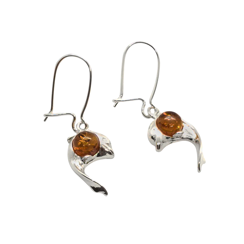 Baltic Amber Sterling Silver Dolphin Earrings. Cognac Amber / Silver Dolphin Earrings On Hooks. Round-shape amber stone set in .925 sterling silver. Dangle earrings on silver hooks. Genuine Baltic Amber jewelry