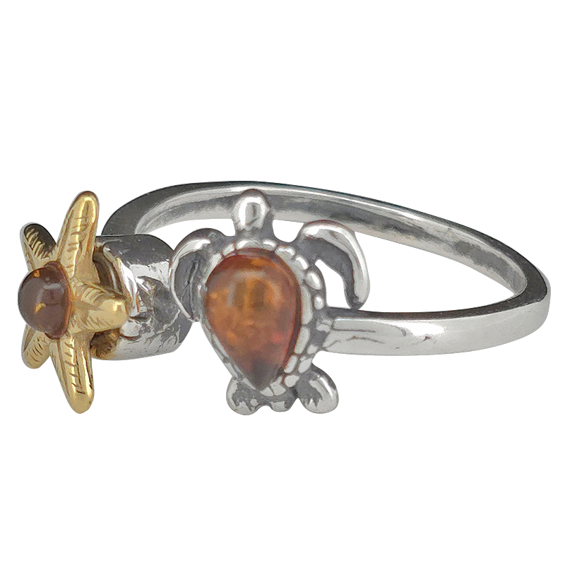 Cognac Amber Starfish And Sea Turtle Adjustable Spinner Ring, Teardrop and round-shaped amber stones are set in .925 sterling silver. The ring features a gold-plated spinning element.
