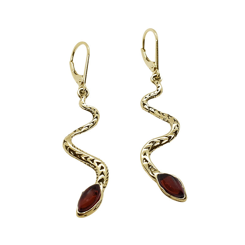 Cherry Amber Gold Plated Silver Snake Earrings On Hooks