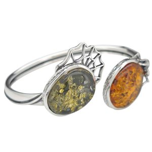 Multi-Color Amber Sterling Silver Spider And Web Cuff Bracelet. Oval-shaped green and cognac color amber stones set in .925 sterling silver—genuine Baltic amber.
