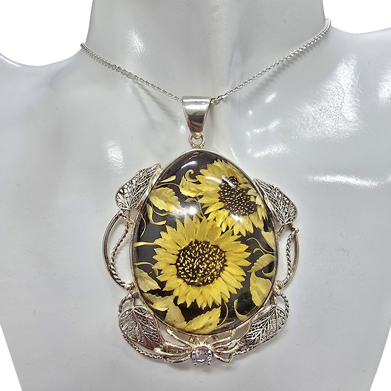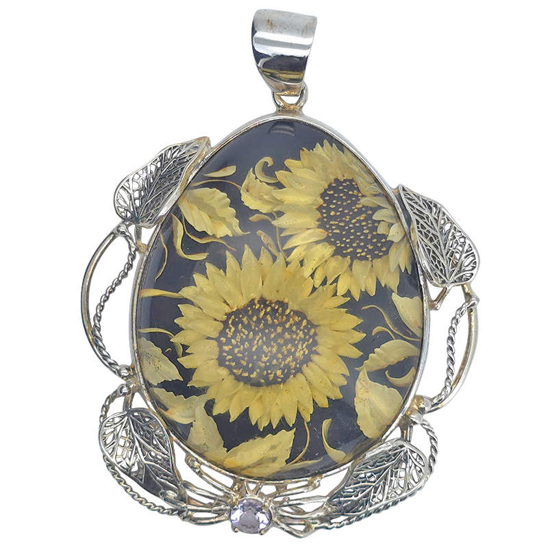 Cameo Amber Silver Sunflower Spider Pendant. Dark cognac amber stone with a carved image of a sunflower set in .925 sterling silver. Round-shaped amethyst gemstone set in .925 sterling silver.
