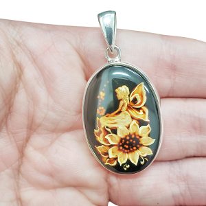 Amber Cameo/Intaglio Fairy on a Sunflower Pendant