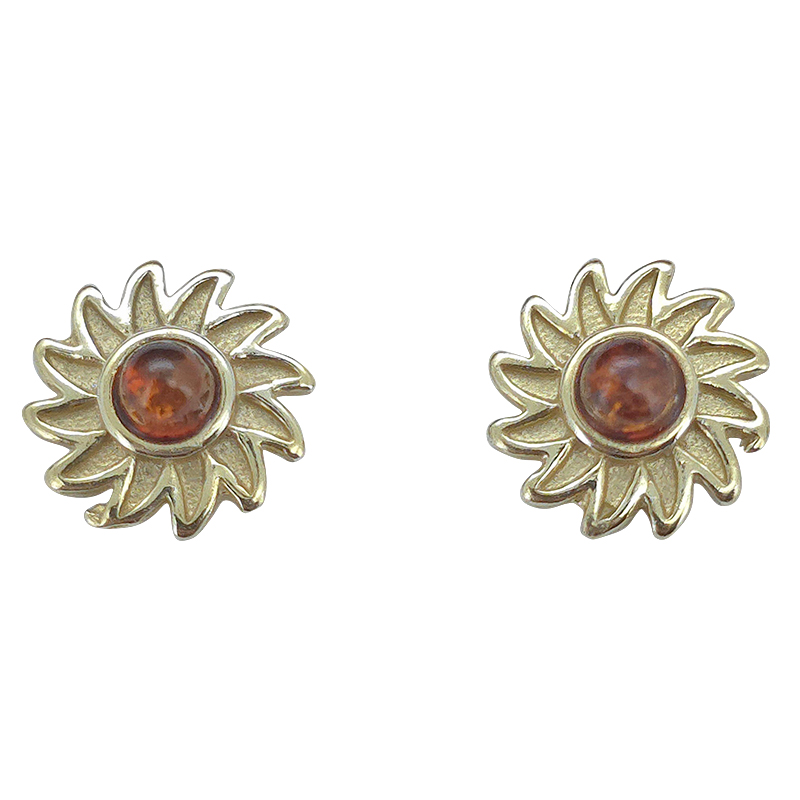 Cognac Amber Gold Plated Silver Flower Stud Earrings. Round-shaped amber stones set in .925 sterling silver. Genuine Baltic amber.