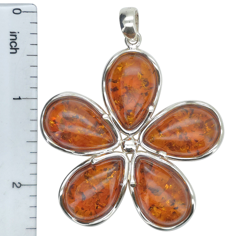 Cognac Amber Sterling Silver Flower Pendant. Teardrop-shaped amber stones set in .925 sterling silver. Genuine Baltic amber.
