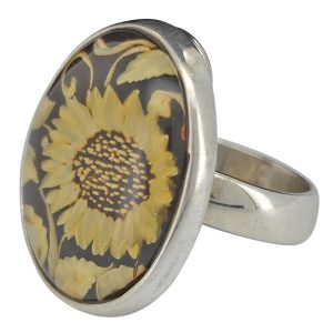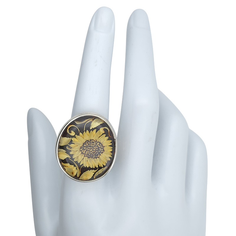 Sunflower Amber Cameo Adjustable Ring. A dark cognac amber stone with a carved image of a sunflower is set in 925 sterling silver—a genuine Baltic amber ring.