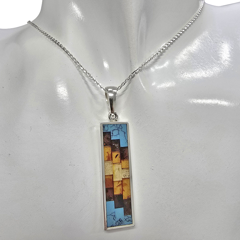 Mosaic Amber / Pressed Turquoise Pendant. This pendant is made by arranging small pieces of turquoise and amber in various shades, set in .925 sterling silver. Genuine Baltic amber pendant.