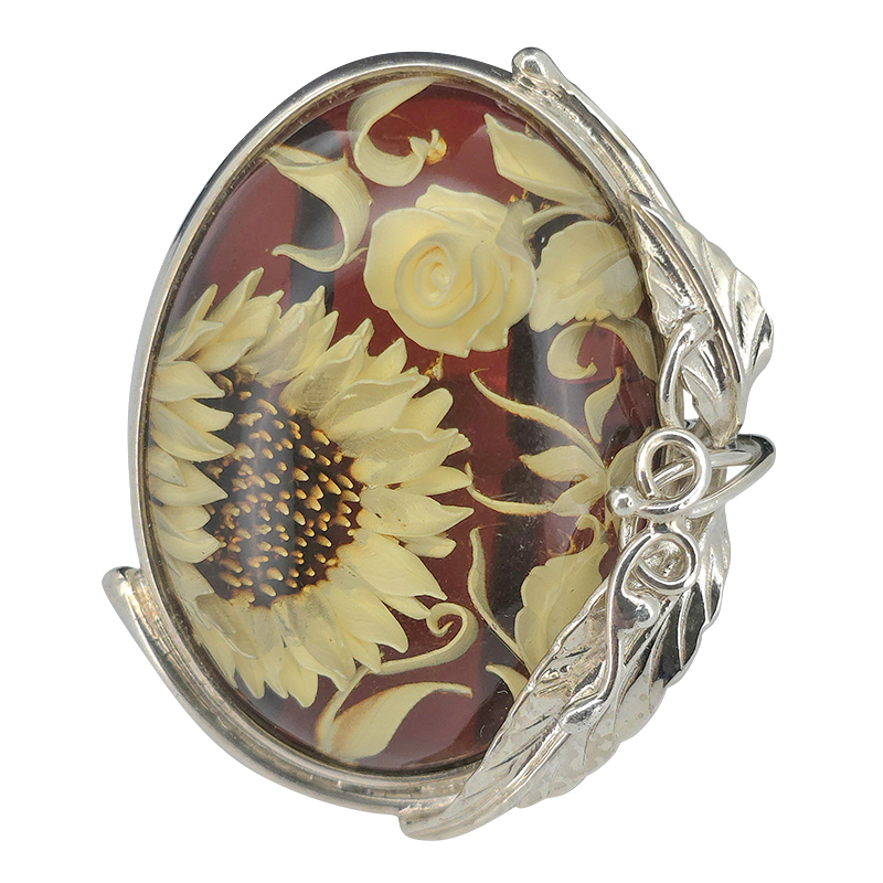 Sunflower Amber Cameo Adjustable Ring. Dark cognac amber stone with a carved image of a sunflower is set in .925 sterling silver. Genuine Baltic amber ring.