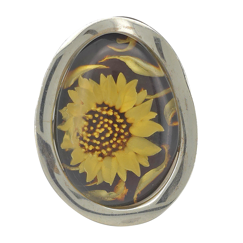 Sunflower Cameo Amber Adjustable Ring. Dark cognac amber stone with a carved image of a sunflower is set in .925 sterling silver. Genuine Baltic amber ring.