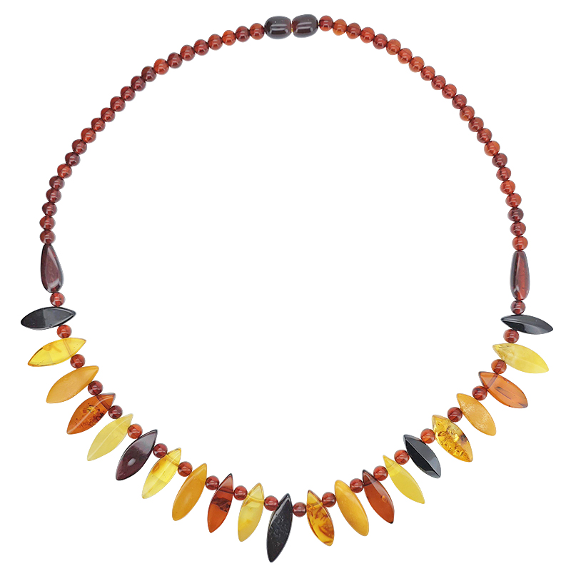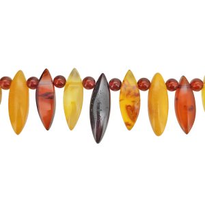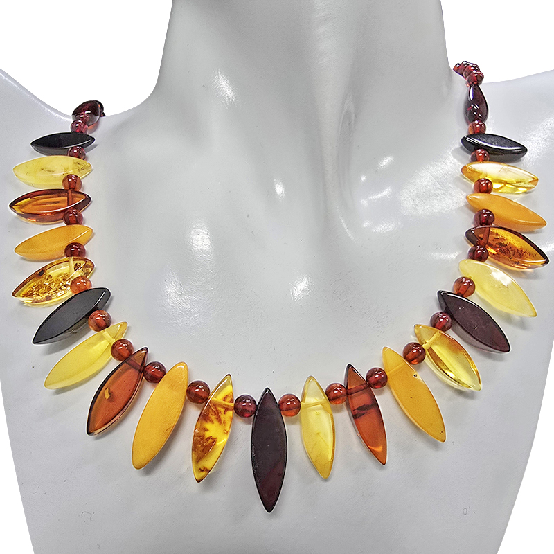 Multicolor Amber Cleopatra-Style Necklace. The necklace is made of marquise and round-shaped amber beads, finished with a screw clasp. Baltic amber beaded necklace is 18″ long.