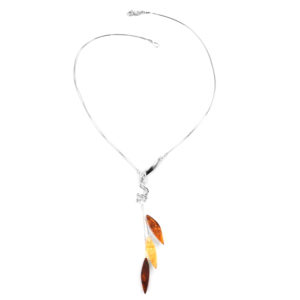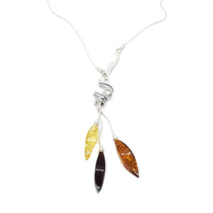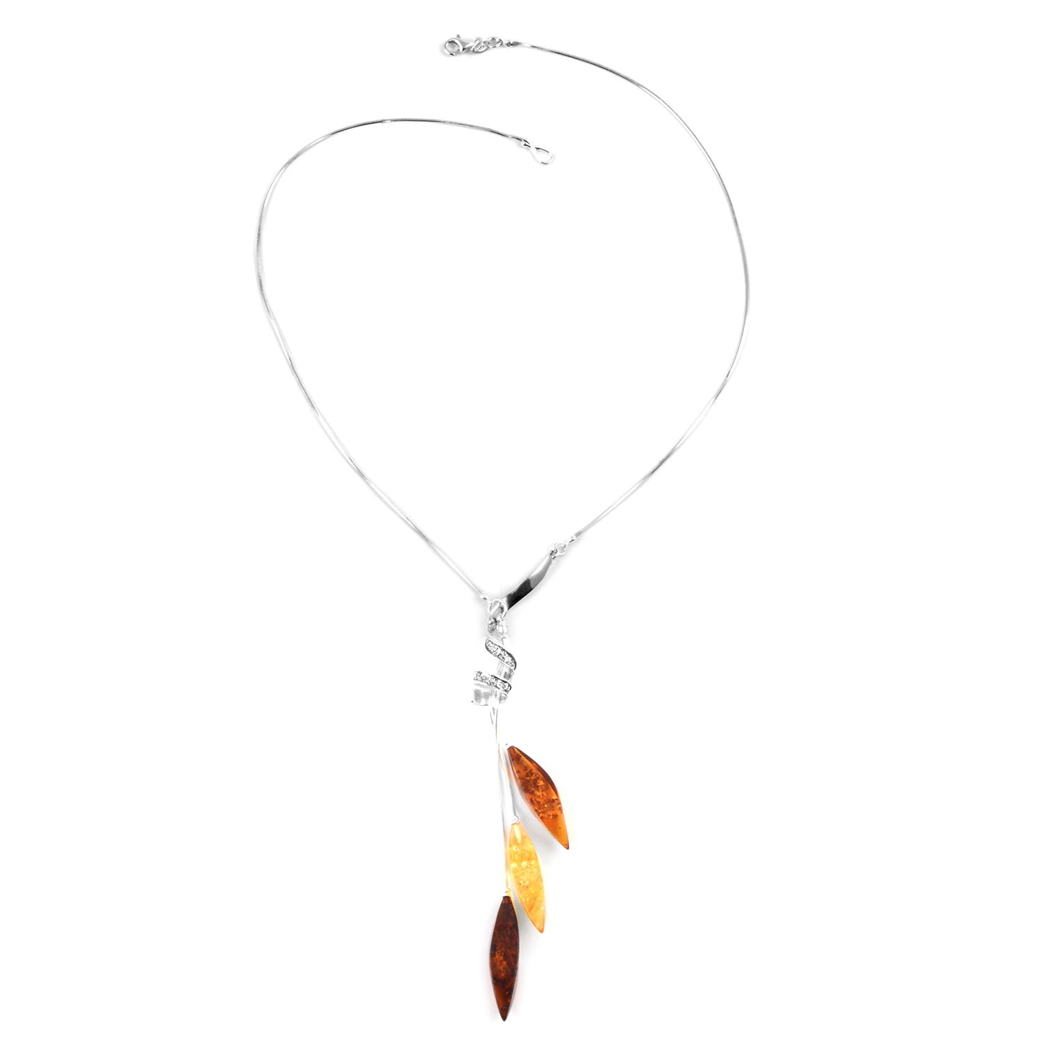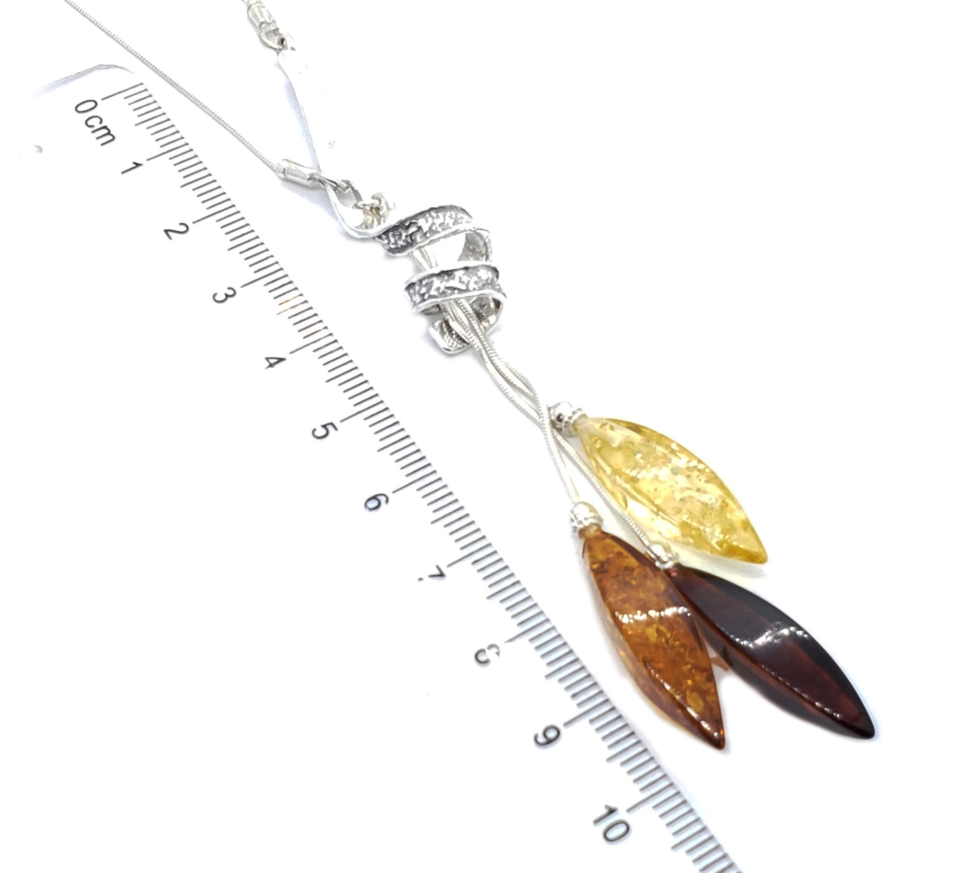 Handmade marquise dangle 3 stone multicolor silver necklace. Marquise-shaped multicolor amber stones are set on .925 sterling silver chain.