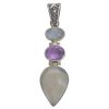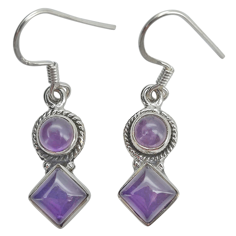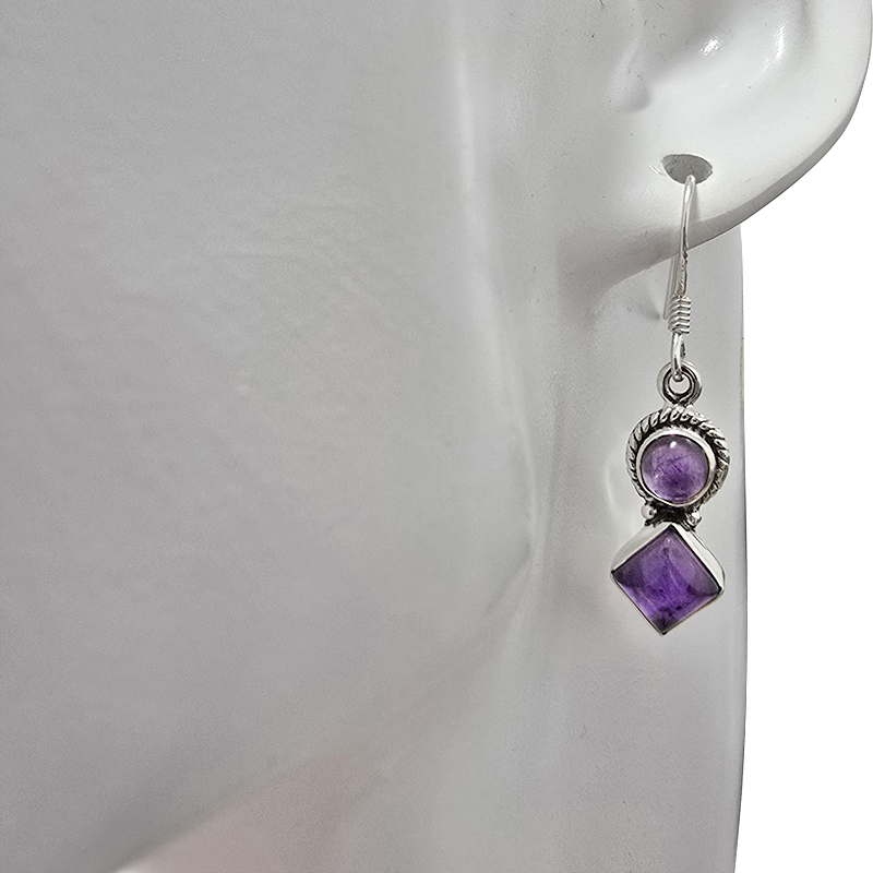 Amethyst 925 Silver Earrings On Hooks. Round and square-shaped amethyst stones are set in .925 sterling silver. Dangle earrings on silver hooks.
