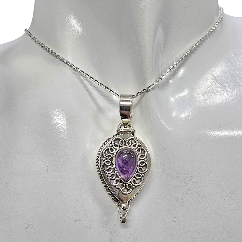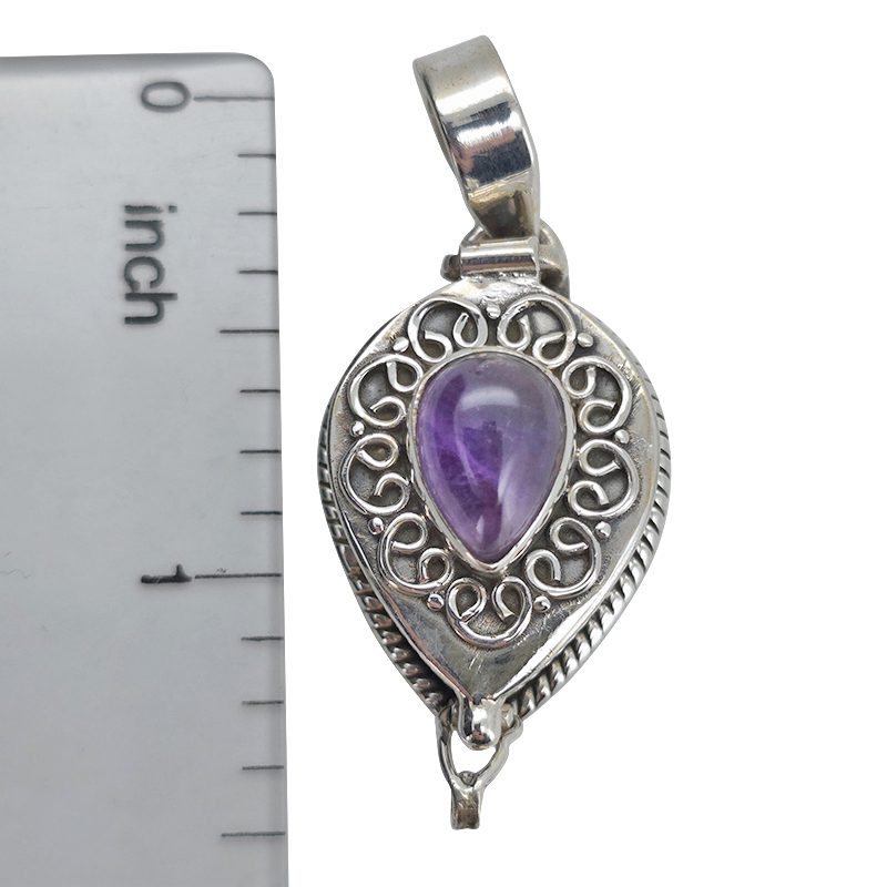 Amethyst Locket / Poison Box Pendant. Teardrop-shaped amethyst stone is set in .925 sterling silver.