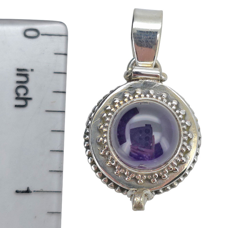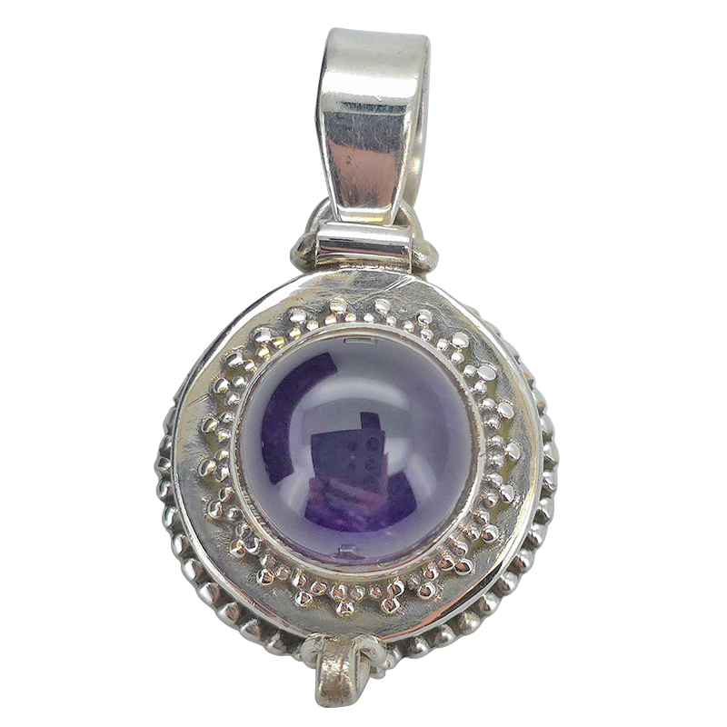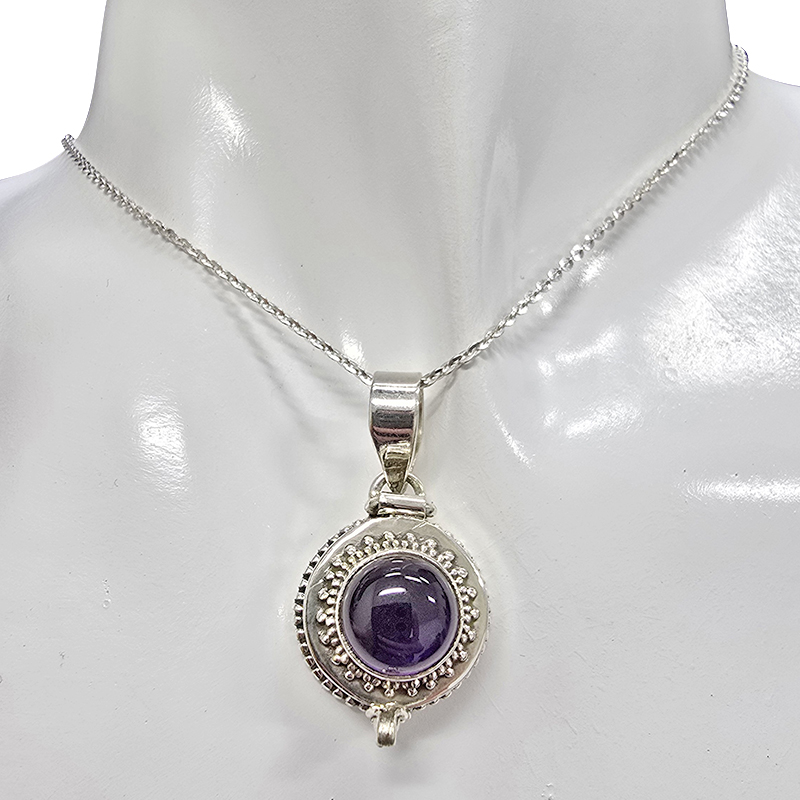 Amethyst Sterling Silver Locket Pendant. Round-shaped gemstone set in .925 sterling silver. Gemstone pendant.