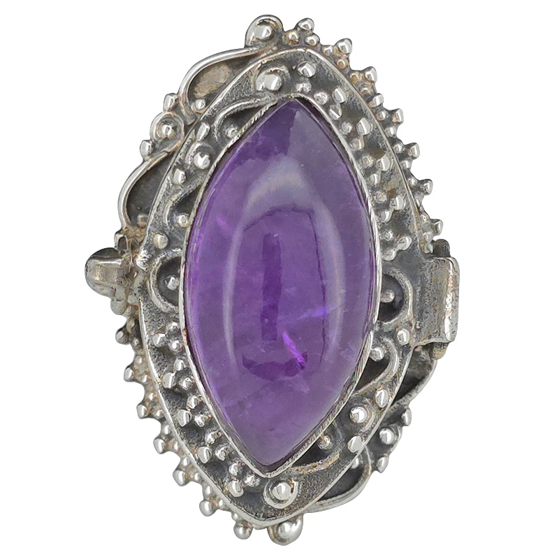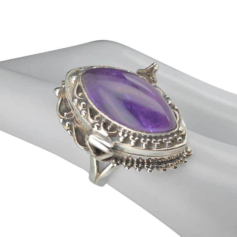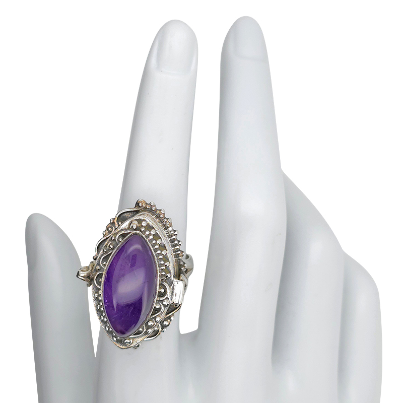 Amethyst Sterling Silver Locket / Poison Ring. Marquise-shaped gemstone set in .925 sterling silver. Designed with a discreet locket compartment for a small keepsake or secret.