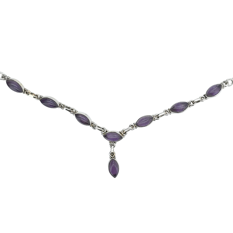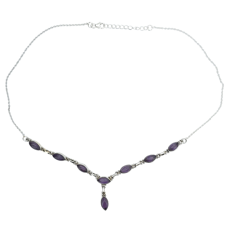 Amethyst Sterling Silver Necklace 18″. Marquise-shaped gemstones set in .925 sterling silver. Gemstone necklace.