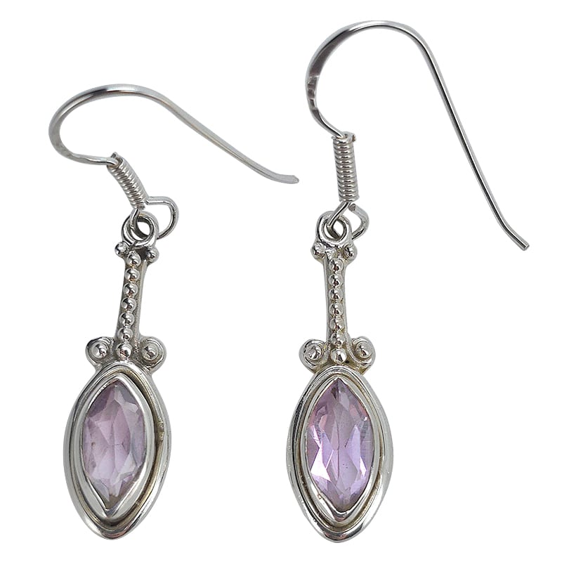 Faceted Amethyst Sterling Silver Earrings On Hooks. Marquise-shaped gemstones set in .925 sterling silver. Gemstone earrings.