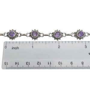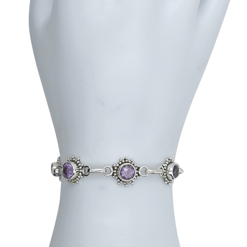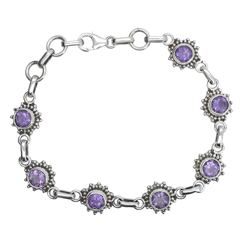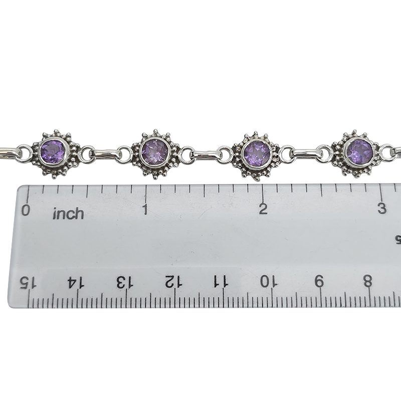 Faceted Amethyst Sterling Silver Link Bracelet. Round-shaped gemstones set in .925 sterling silver. Gemstone bracelet.