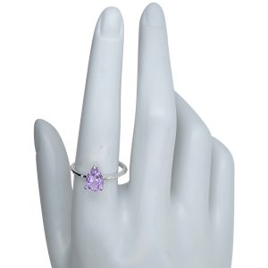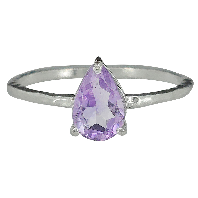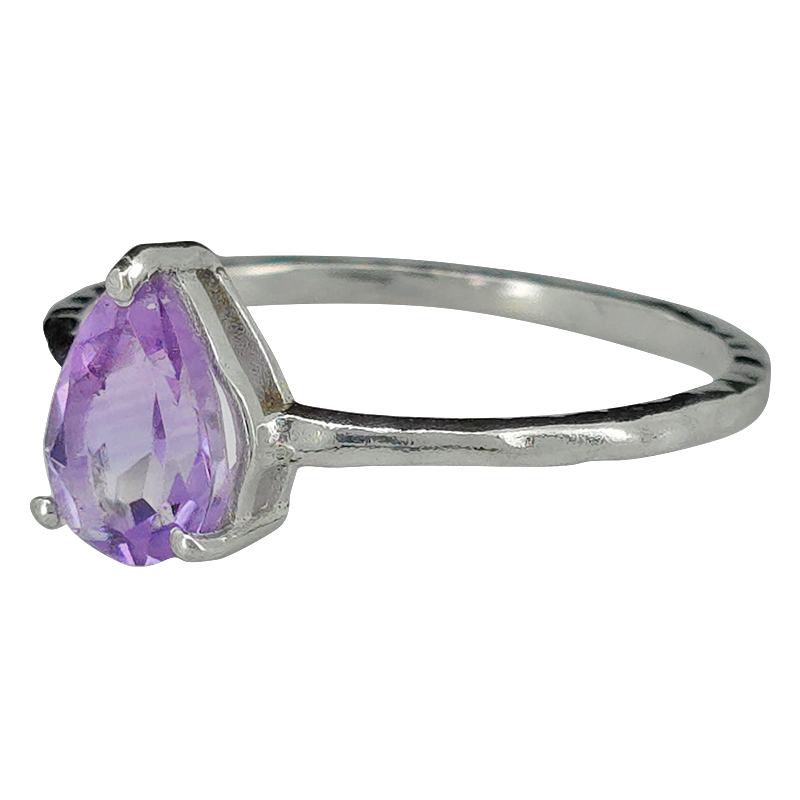 Faceted Amethyst Sterling Silver Ring. A teardrop-shaped amethyst stone is set in .925 sterling silver. Features a thin sterling silver band.