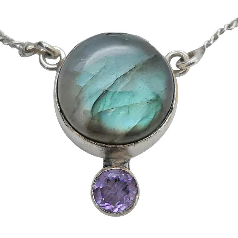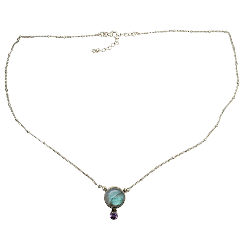 Labradorite/Amethyst Sterling Silver Necklace 20″. Round-shaped gemstones are set in .925 sterling silver.