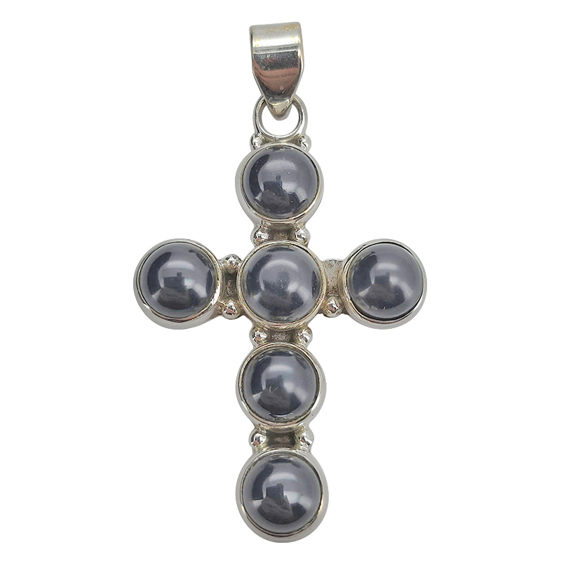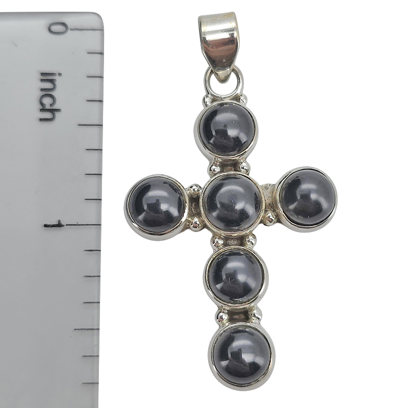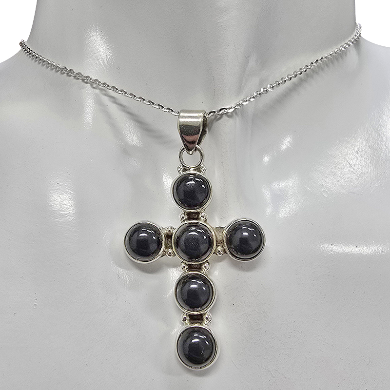 Black Onyx Sterling Silver Cross Pendant. Round-shaped Black onyx stones are set in .925 sterling silver.