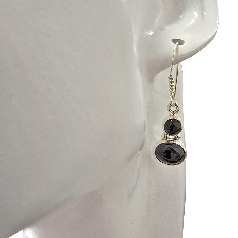 Black Onyx Sterling Silver Earrings On Hooks. Oval and round-shaped gemstones are set in .925 sterling silver.