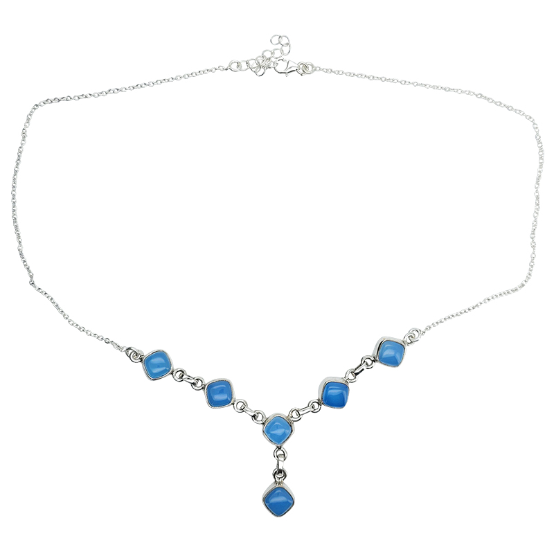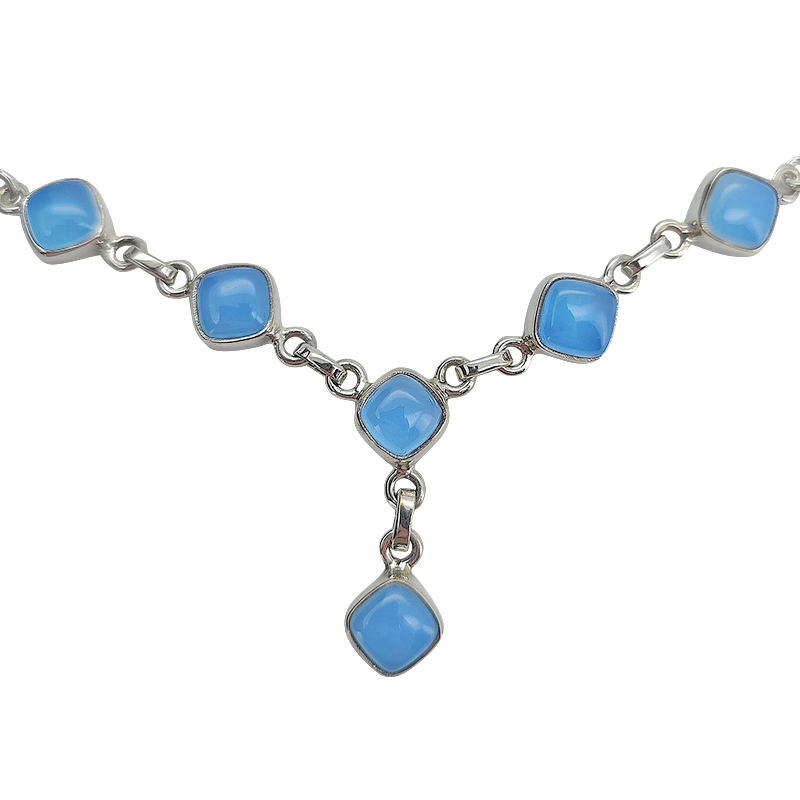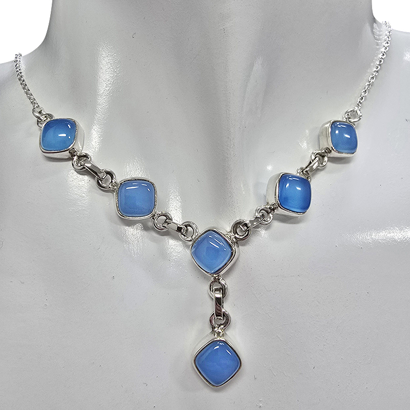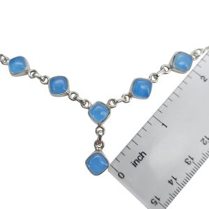 6-Stone blue chalcedony silver necklace 18″. The square-shaped blue chalcedony stones are set in .925 sterling silver. The 18″ long necklace has an extension chain.