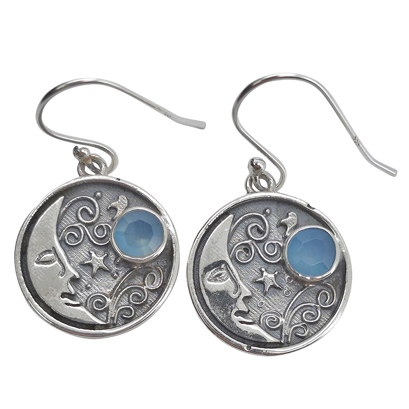 Blue Chalcedony Sterling Silver “Moon” Earrings. Round-shaped faceted blue chalcedony stones are set in .925 sterling silver. The silver setting features a moon and star design. Dangle earrings on silver hooks.