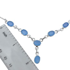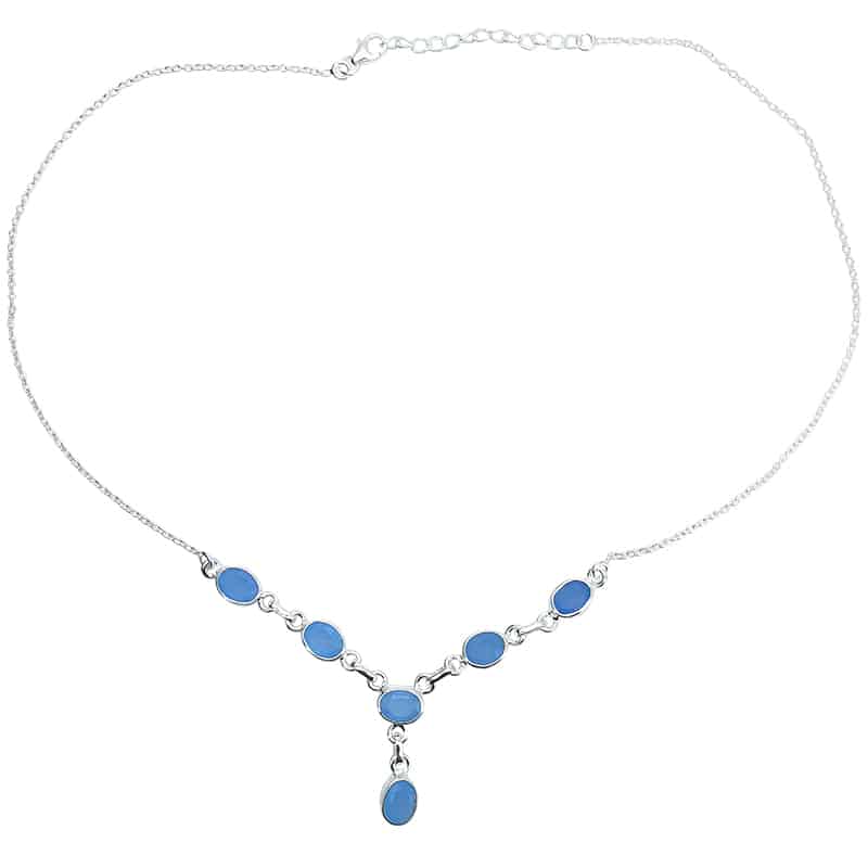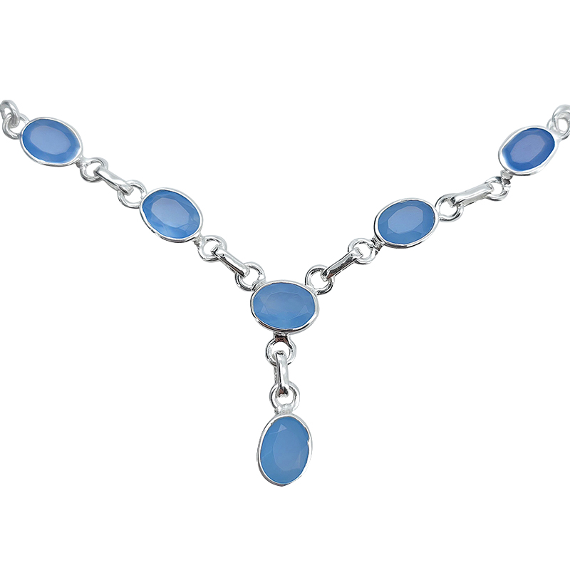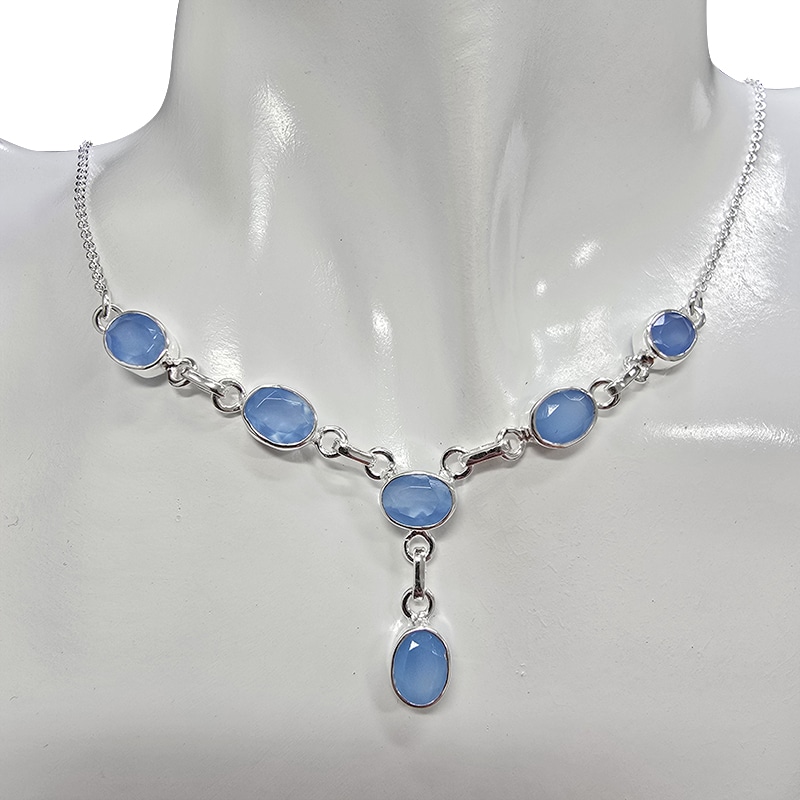 Faceted Blue Chalcedony Sterling Silver Necklace. The oval-shaped blue chalcedony stones are set in .925 sterling silver. The 18″ long necklace has an extension chain.
