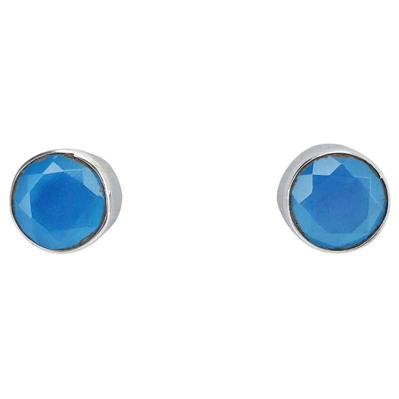 Faceted Blue Chalcedony Stud Earrings. Round-shaped blue chalcedony stones are set in .925 sterling silver.