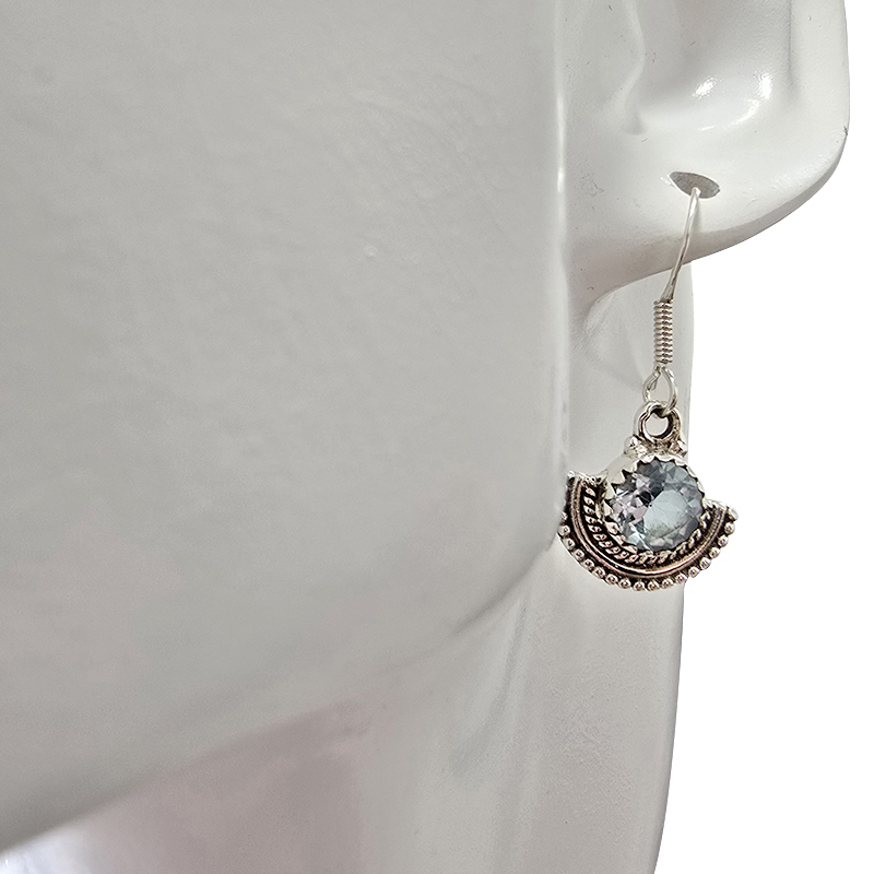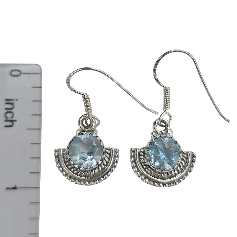 Faceted Blue Topaz Sterling Silver Earrings On Hooks. Round-shaped gemstone set in .925 sterling silver.