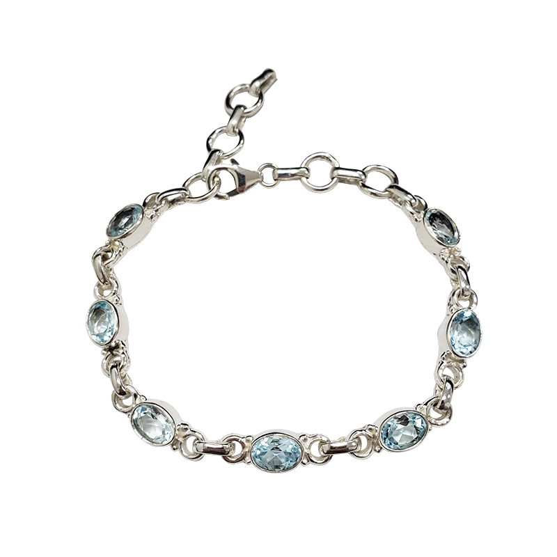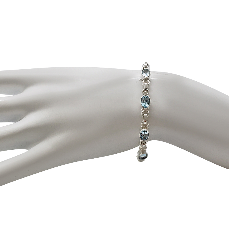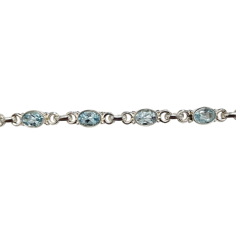 Faceted Blue Topaz Sterling Silver Link Bracelet. Faceted oval-shaped blue topaz stones are set in .925 sterling silver. 7.5″ long link bracelet.