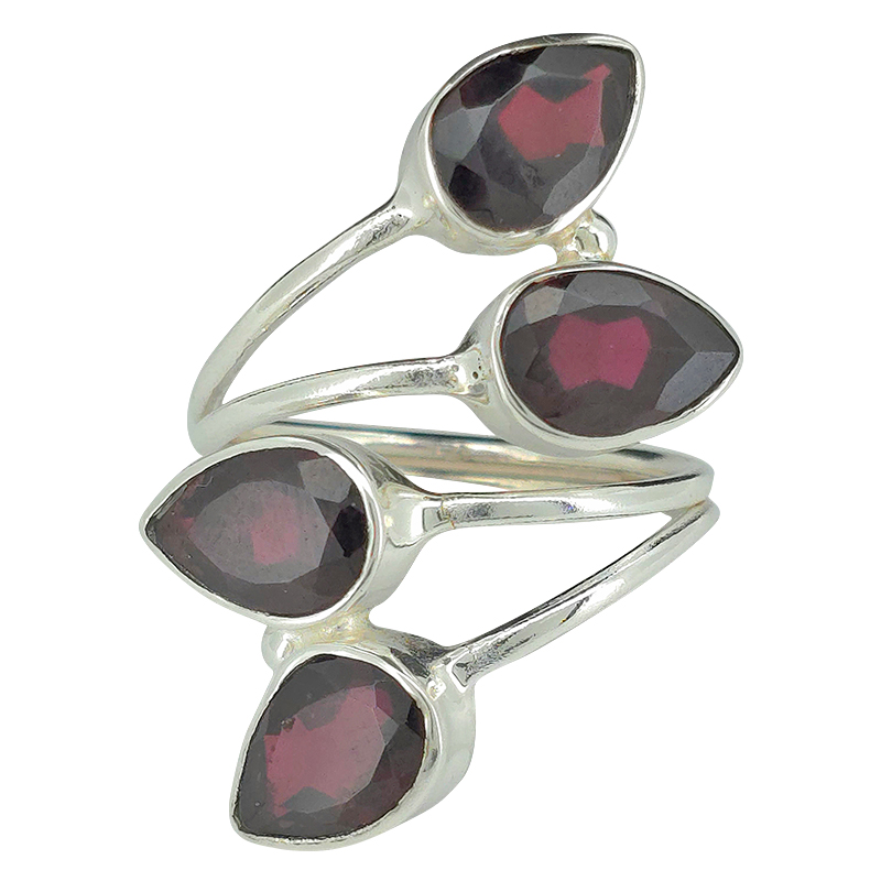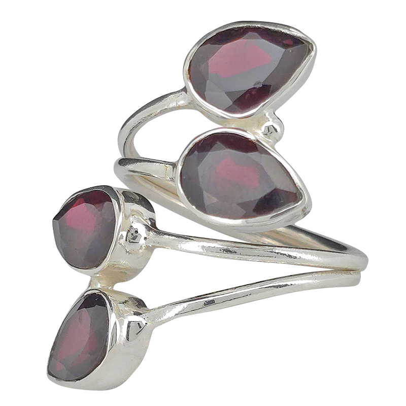 Climbing teardrop 4-stone faceted garnet sterling silver adjustable ring. Teardrop-shaped faceted garnet stones are set in .925 sterling silver. Gemstone ring.