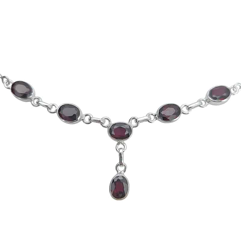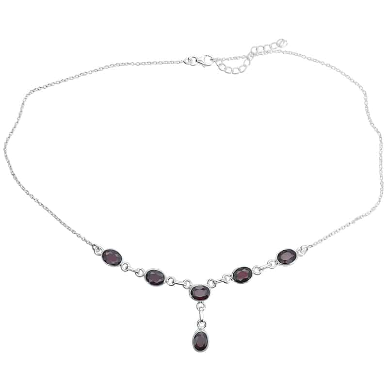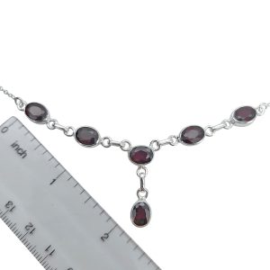 Faceted Garnet Sterling Silver Necklace. Oval-shaped faceted garnet stones are set in .925 sterling silver. The 18″ long necklace has an extension chain.