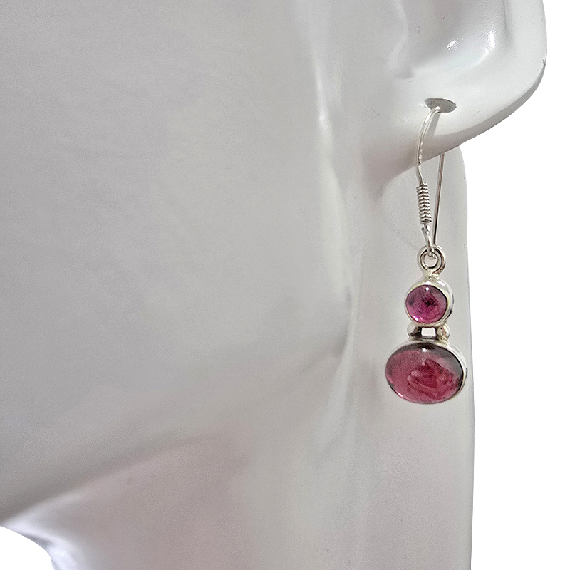 Garnet Sterling Silver Earrings On Hooks. Oval and round-shaped gemstones are set in .925 sterling silver.