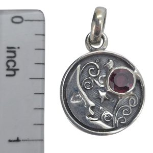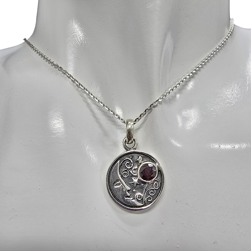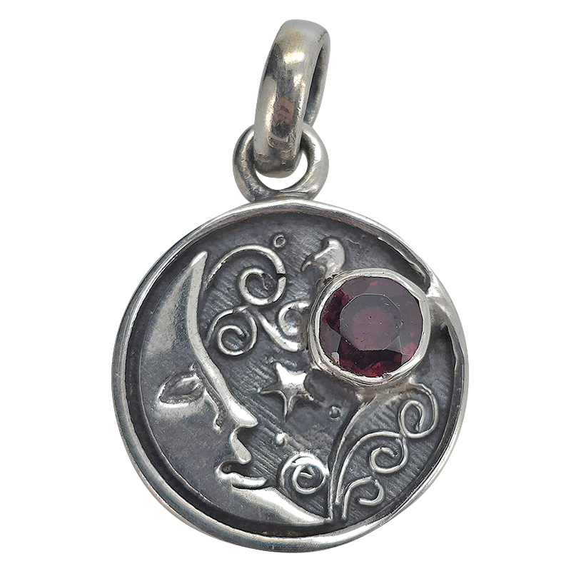 Garnet Sterling Silver “Moon” Pendant. A round-shaped faceted garnet stone is set in .925 sterling silver. The silver setting features a moon and star design.