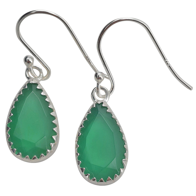 Faceted Green Onyx Sterling Silver Earrings On Hooks. Teardrop-shaped gemstones set in .925 sterling silver. Gemstone earrings.